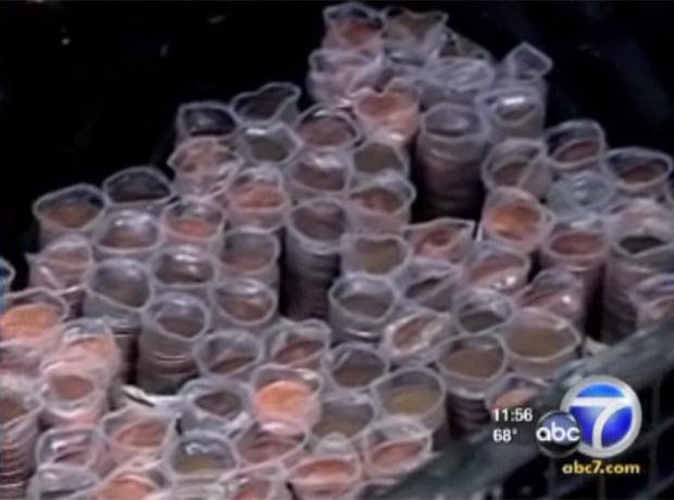 Este caso ocorreu em Mira Mesa, no estado da Califórnia. O norte -americano Thierry Cahez pagou a fatura do cartão de crédito de US$ 6,5 mil com 650 mil moedas de um centavo em Mira Mesa, no estado da Califórnia (EUA). Cahez disse que decidiu pagar a fatura com moedas de um centavo, porque estava insatisfeito com o seu banco, que negou o pedido de refinanciamento da dívida, segundo a emissora de TV "ABC".